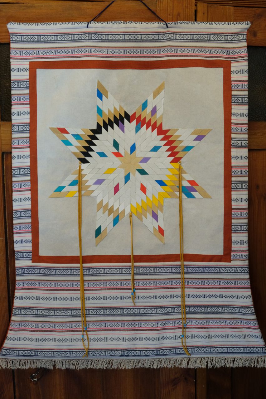 Jeder Wandbehang ist ein handgefertigtes Einzelstück in unterschiedlichen Farben. Das Sternmotiv und der Stoffrahmen sind inspiriert vom Lakota Morningstar aus Nordamerika und dem…